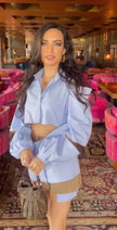 The Maddie Fitzpatrick cord set is a deconstructed blue cotton piece with strategic cuts at the waist, sleeve, and shoulder. This oversized shirt blends edgy and sexy, offering comfort and style. Accentuated by beige brown piping, it can be styled in multiple ways.