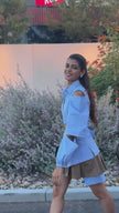 The Maddie Fitzpatrick cord set is a deconstructed blue cotton piece with strategic cuts at the waist, sleeve, and shoulder. This oversized shirt blends edgy and sexy, offering comfort and style. Accentuated by beige brown piping, it can be styled in multiple ways.
